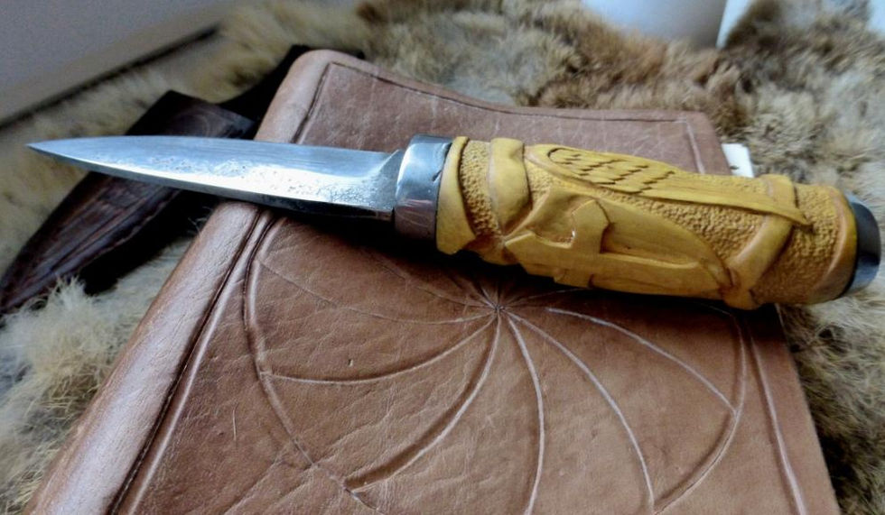 Lame en acier ressort forgée, trempée et revenue. Mitres en acier et manche en buis sculpté. Cornaline collée et enchâssée sur le manche à l'aide d'une bague en buis. Montage sur soie traversante. Fourreau en cuir de bovin tannage végétal repoussé, teinté au brou de noix et ciré avec un mélange à base de cire d'abeille.